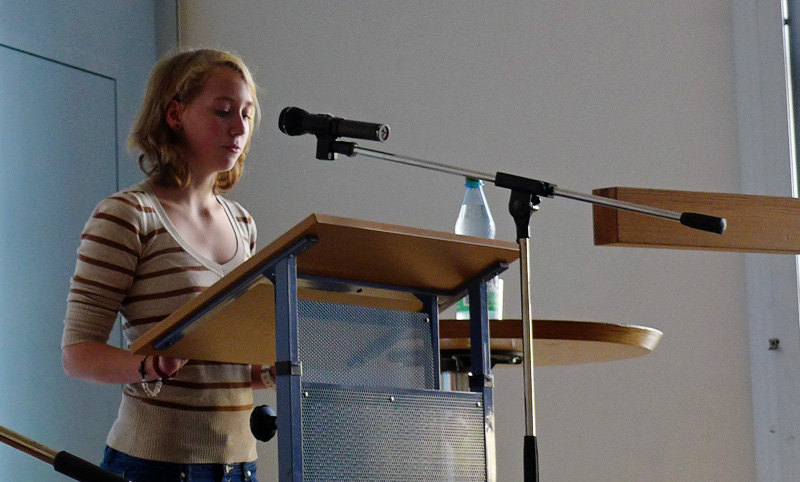 Mit dem Lied "Krieg" (Gerhard Gundermann), gesungen von Sophia Will, Maxie Herzberg und Matthias Höll wurde die Veranstaltung musikalisch eröffnet. Nach der Begrüßung durch Schulleiter Günter Kiefer las Lea Nerger "Ordnung" von R. Kunze.