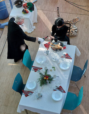 Und wie sie es lieben! Auch im Johanneum herrschte ausgelassene Stimmung an diesem Tag, da Mister Campbell in der Rolle des Butlers voll aufging. Dabei haben die beiden Hauptdarsteller kaum Zeit gehabt, vernünftig zu proben: