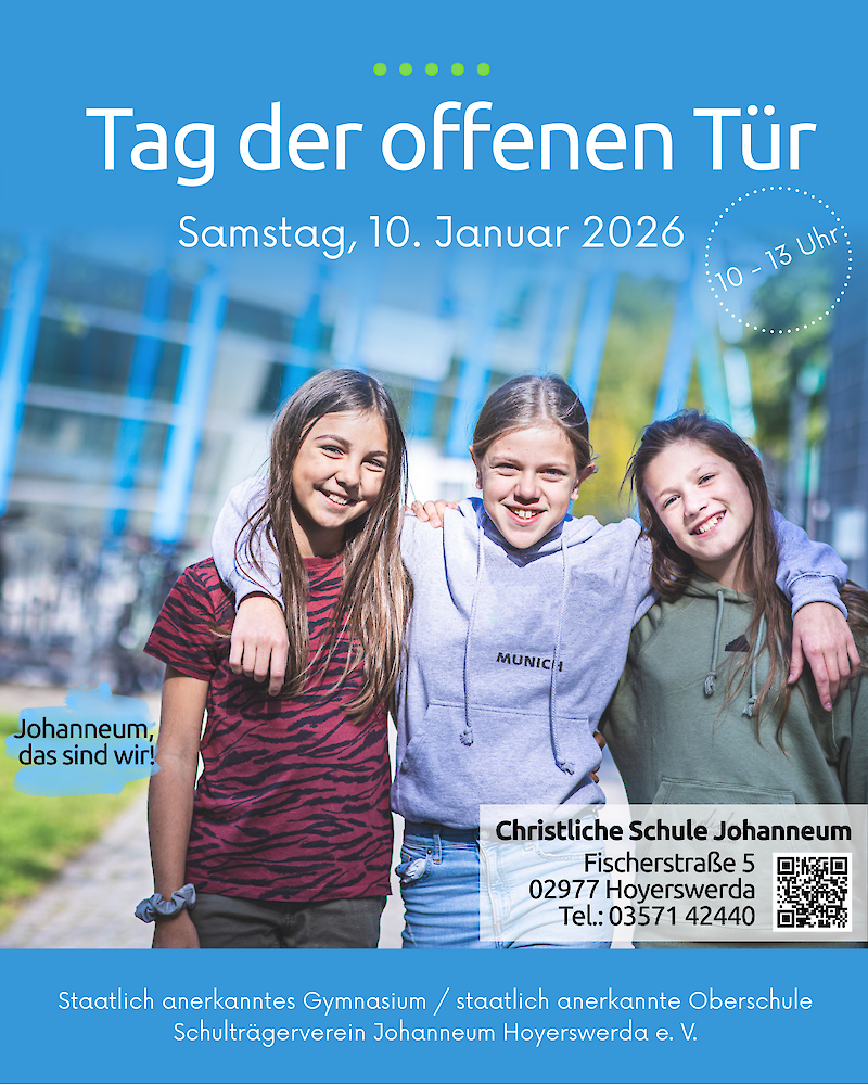 Das neue Jahr startet direkt mit einem Höhepunkt. Unser Tag der offenen Tür findet am 10. Januar 2026 von 10:00 – 13:00 Uhr statt. Unter dem Motto "Johanneum, das sind wir!" präsentieren unsere Schülerinnen und Schüler gemeinsam mit Lehrkräften spannende Projekte, bunte Klassenräume, Experimente und Bühnenbeiträge. Auch unsere Kooperationspartner stellen ihre Arbeit vor und Sie erhalten alle Informationen rund um die Themen Schulform, Schullaufbahn und Schulgeld. Wir freuen uns darauf, Sie mit Ihren Familien und Freunden bei uns willkommen zu heißen!
