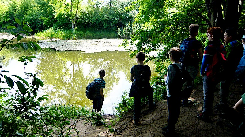 "Was ist denn aber nun ein Wald?" Am selben Tag ging es auf Bio-Exkursion. Fast alles, was wir im Unterricht gelernt hatte, konnten wir in dem kleinen Stadtwäldchen hinter dem Gondelteich sehen und hören. Selbst die Nachtigall zwitschert live.