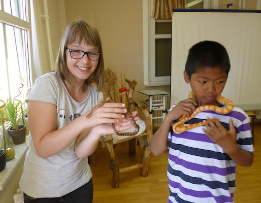 Wir fanden besonders gut, dass wir viele Tiere anfassen durften, so dass wir auch fühlen konnten, wie die Haut, die Federn oder das Fell beschaffen sind. Manche trauten sich sogar eine Königsphyton um den Hals zu legen, einen Springfrosch auf der Hand zu halten und den Herzschlag eines Entenkükens zu fühlen.