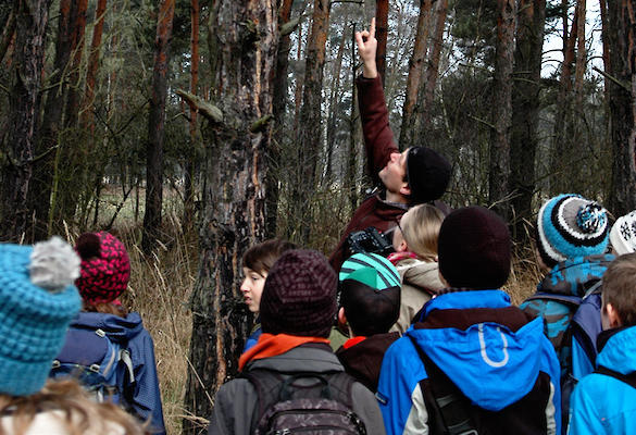 Auf Spurensuche trafen die Fünftklässler auf einen Fuchsbau, durchwanderten Moorgebiete, die typisch für diese Region sind und bekamen mit Spiel und Spaß Wissen vermittelt. So demonstrierte Herr Kaasche aktiv die Jadg des Wolfes nach einem Reh mit Hilfe eines Schülers, welcher allerdings völlig demotiviert die Jagd abbrach. Kommentar des Schülers: „Meine Beute (Herr Kaasche) hat sich die ganze Zeit kaputt gelacht, da hatte ich irgendwann keinen Bock mehr hinterher zu laufen.“ So einfach war es, den Spiegel, also die weiße Schwanzfläche des Rehs und seine Funktion zu verdeutlichen. Der Grund, warum der Wolf dem Reh nicht hinterherjagt.
